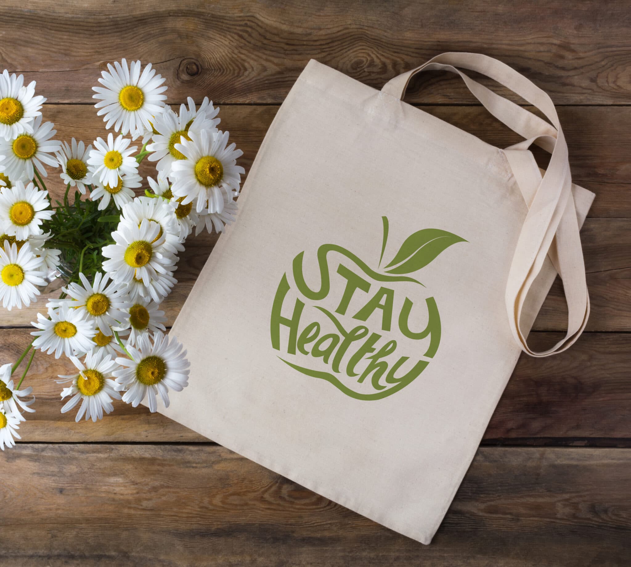 Canvas tote bag mockup with daisy bouquet. Rustic lines shopper bag mock up for branding presentation.